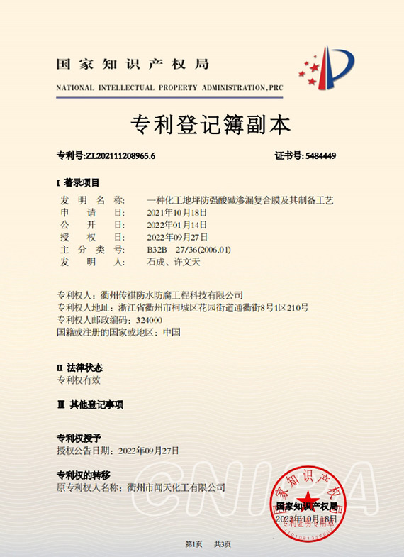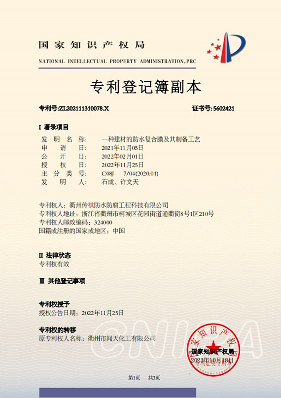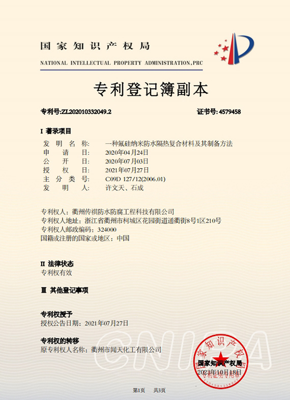 衢州傳祺新材料科技有限公司是衢州市聞天化工有限公司的下屬企業(yè);衢州市聞天化工有限公司成立于2003年,是國(guó)內(nèi)最早研發(fā)、生產(chǎn)氟碳涂料的企業(yè)之一。衢州傳祺新材料科技有限公司成立于2017年,公司專(zhuān)注于高分子氟材料的開(kāi)發(fā)和含氟材料在防腐、防水領(lǐng)域的應(yīng)用。經(jīng)過(guò)6年的不懈努力,已獲得了化工和建筑領(lǐng)域六項(xiàng)國(guó)家發(fā)明專(zhuān)利授權(quán)和兩項(xiàng)新產(chǎn)品科技成果獎(jiǎng),參與了中國(guó)建筑材料流通協(xié)會(huì)《房屋修繕?lè)浪こ桃?guī)范》標(biāo)準(zhǔn)的編制工作,中建協(xié)涂裝委員會(huì)浙西工作站設(shè)立在我公司。